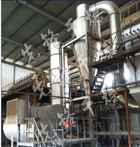 干燥采用自然风,自然风经过空气过滤器后,由风机鼓入空气加热设备内被加热,加热后的热风再经闪蒸主机热风分配器,分配成均匀、一定流速、流向的旋风。旋风与螺旋加料器加入的湿物料接触、碰撞,开始质热交换、分离等一系列的物理变化,使得物料与所含湿份分离,终达干燥。