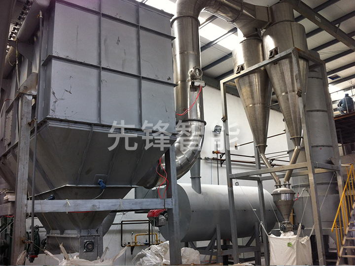 经过初、中效过滤的环境空气由干燥系统引风机吸入热风空气,与蒸汽换热后产生的热风进入闪蒸干燥主机,与经过螺旋加料器送入干燥主机的待干燥滤饼,在干燥主机内完成传热传质的干燥过程,气固混合物由旋风分离器和布袋除尘器分离,物料被从干燥系统气体内分离出来,排出干燥系统,尾气由引风机排入大气。
